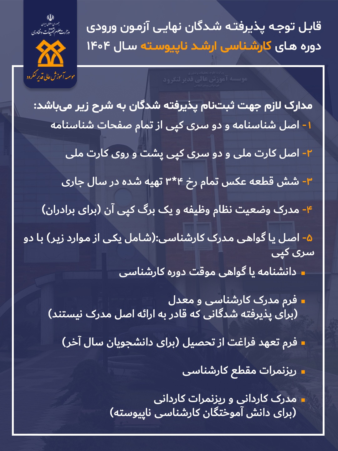 قابل توجه پذیرفته شدگان نیمسال اول سال تحصیلی 1404 ، مدارک مورد نیاز جهت ثبت نام به شرح تصاویر زیر می‌باشد ، لطفا با دقت مطالعه شد.