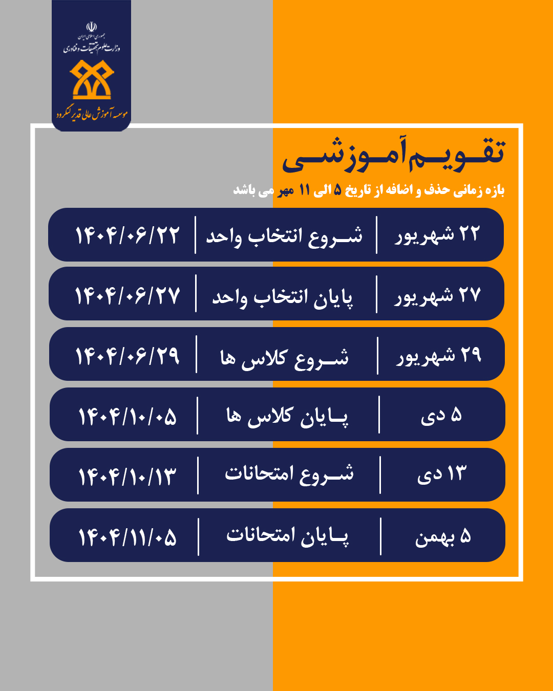 به اطلاع اساتید گرامی و دانشجویان عزیز می رساند , تقویم آموزشی نیمسال اول سال تحصیلی 1405- 1404 موسسه آموزش عالی قدیر لنگرود جهت اطلاع کلیه عزیزان به شرح ذیل می باشد .
