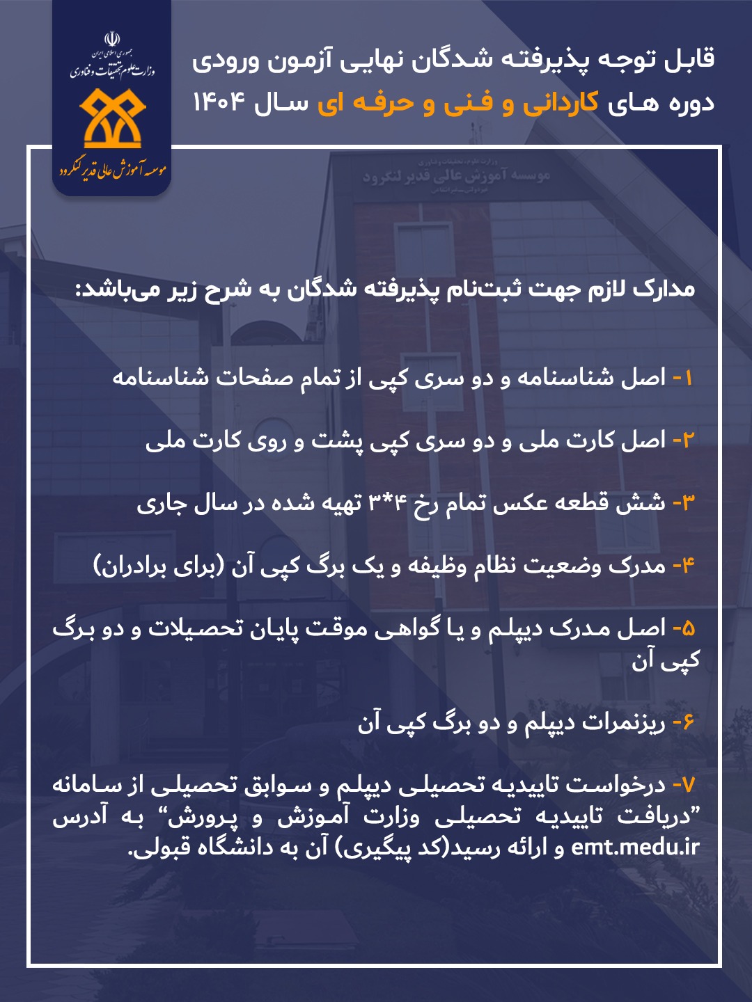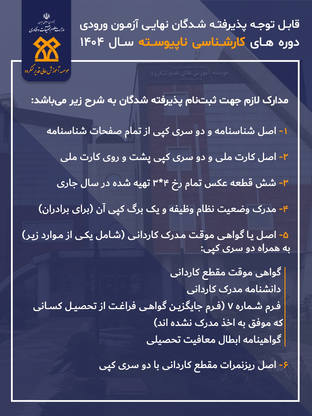قابل توجه پذیرفته شدگان نیمسال اول سال تحصیلی 1404 ، مدارک مورد نیاز جهت ثبت نام به شرح تصاویر زیر می‌باشد ، لطفا با دقت مطالعه شد.